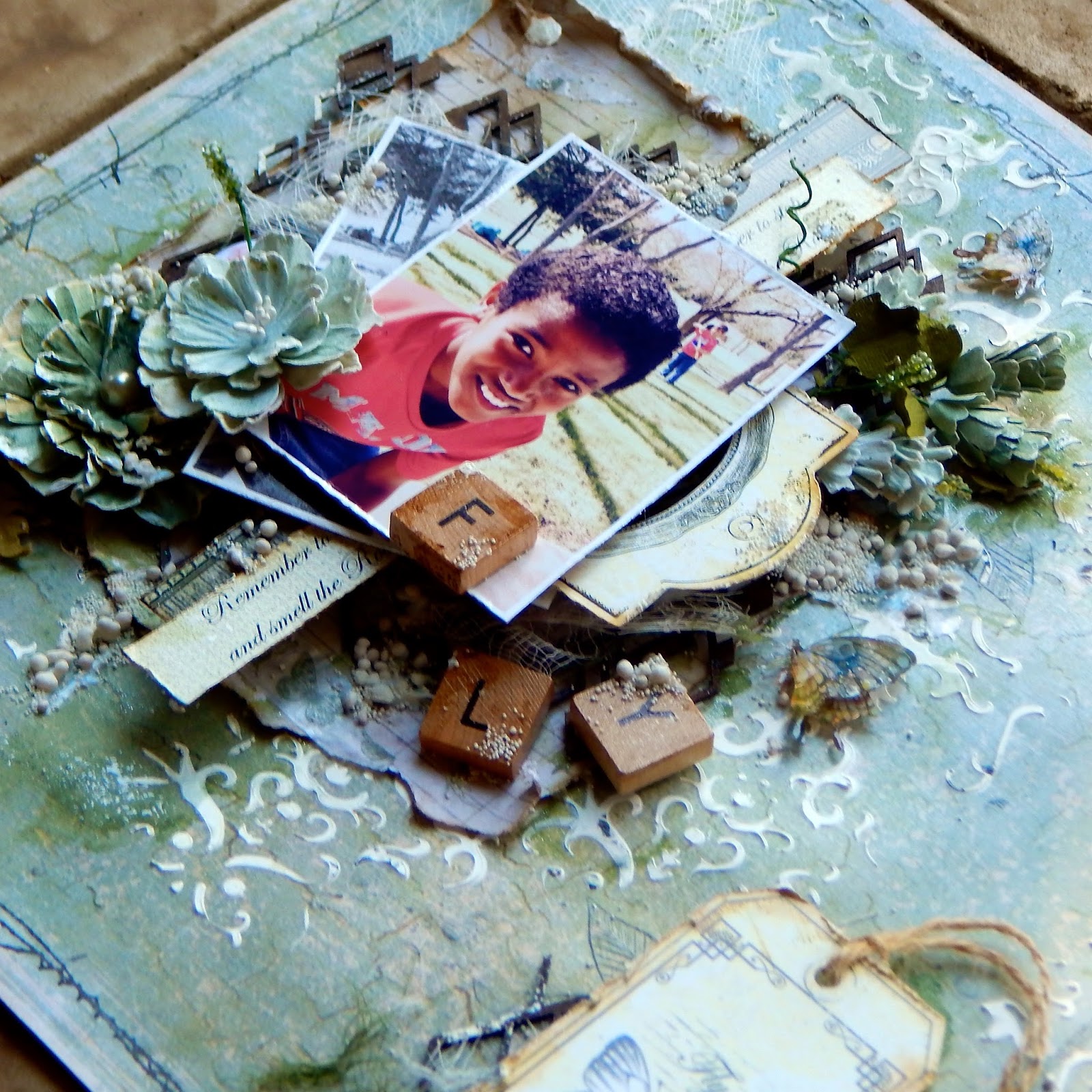 I've been waiting for an opportunity to scrap this awesome photo of my grandson Isaac taken on Easter, 2016. He's been part of our family since 2010 and he's truly a sweetheart. Funny, highly intelligent and get this ... a paper crafting dude! Give him some paper and he can make anything! So, I'm not sure if he'll be a rocket scientist or another Tim Holtz. I guess time will tell!